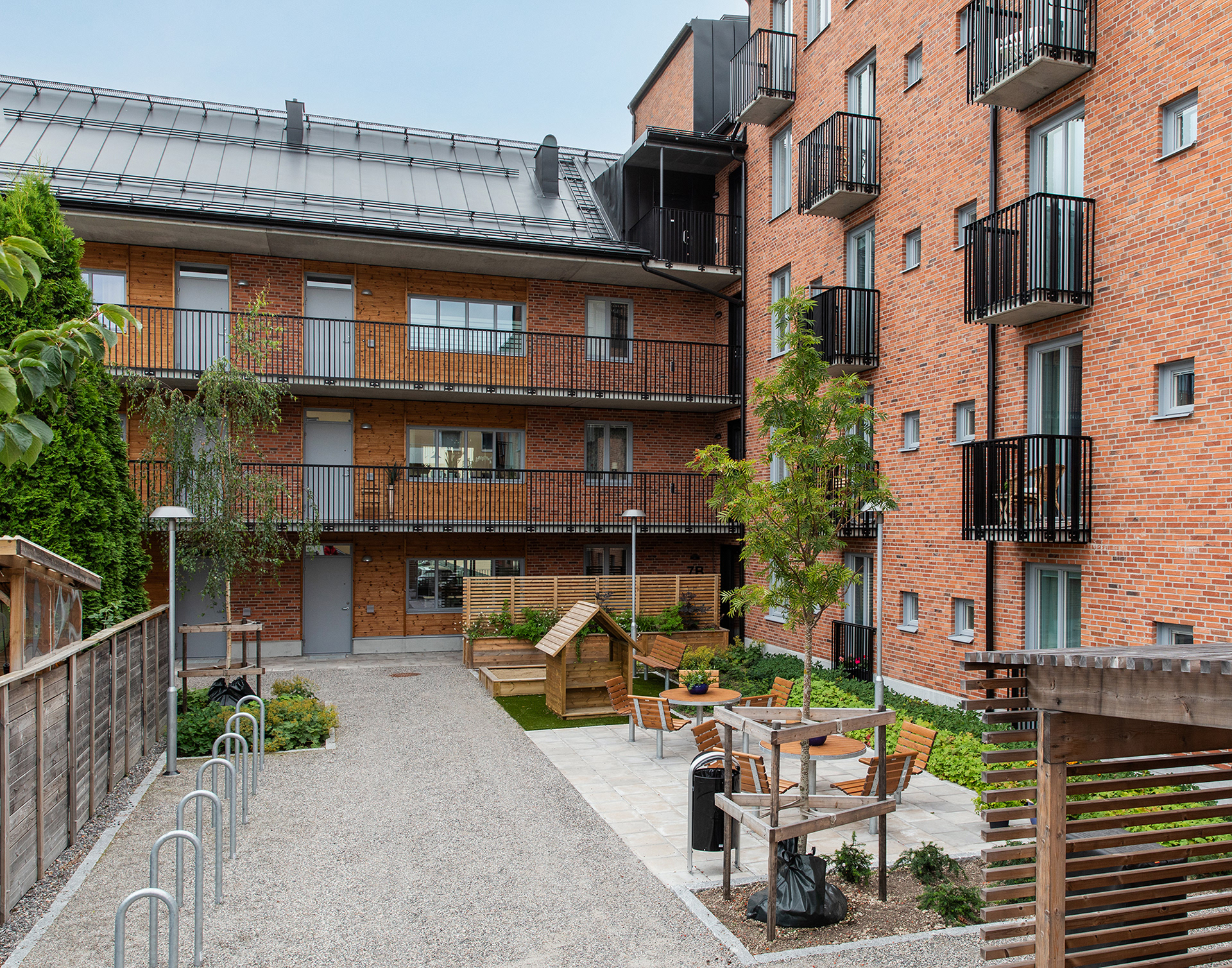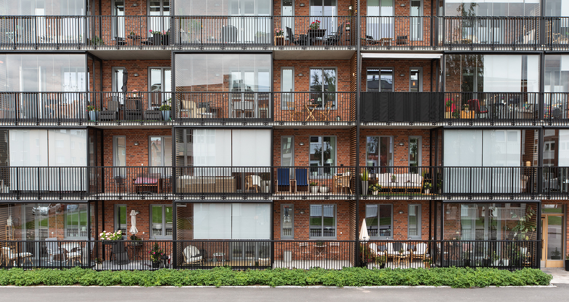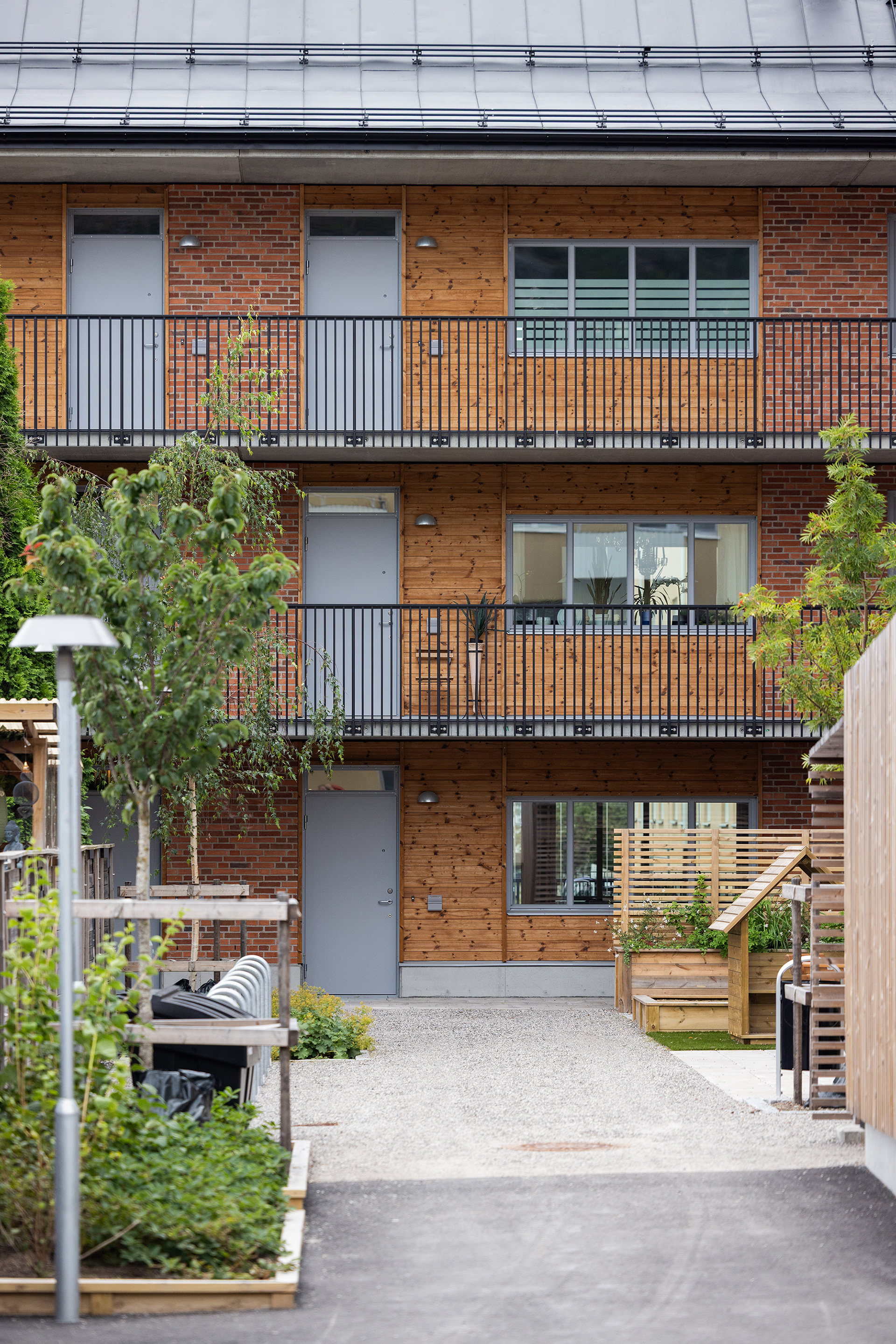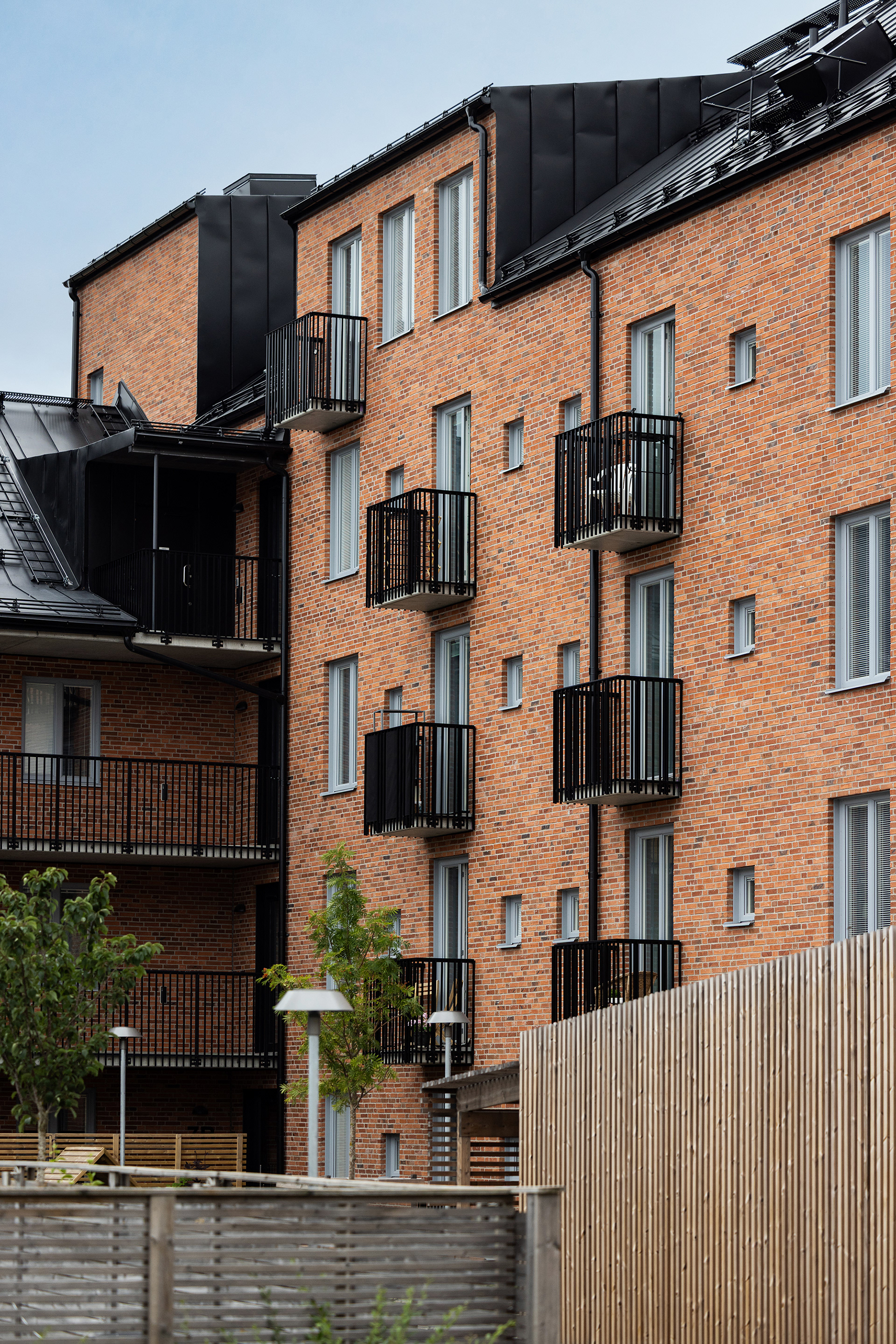 Generösa balkonger ger varje lägenhet en tydlig koppling till omgivningen och förlänger livet utomhus. Sovrum och mindre frukostbalkonger vetter mot den lugna gården, som erbjuder plats för odling och sociala möten. Vardagsrum och kök ansluter till en större västbalkong som fångar kvällssolen.