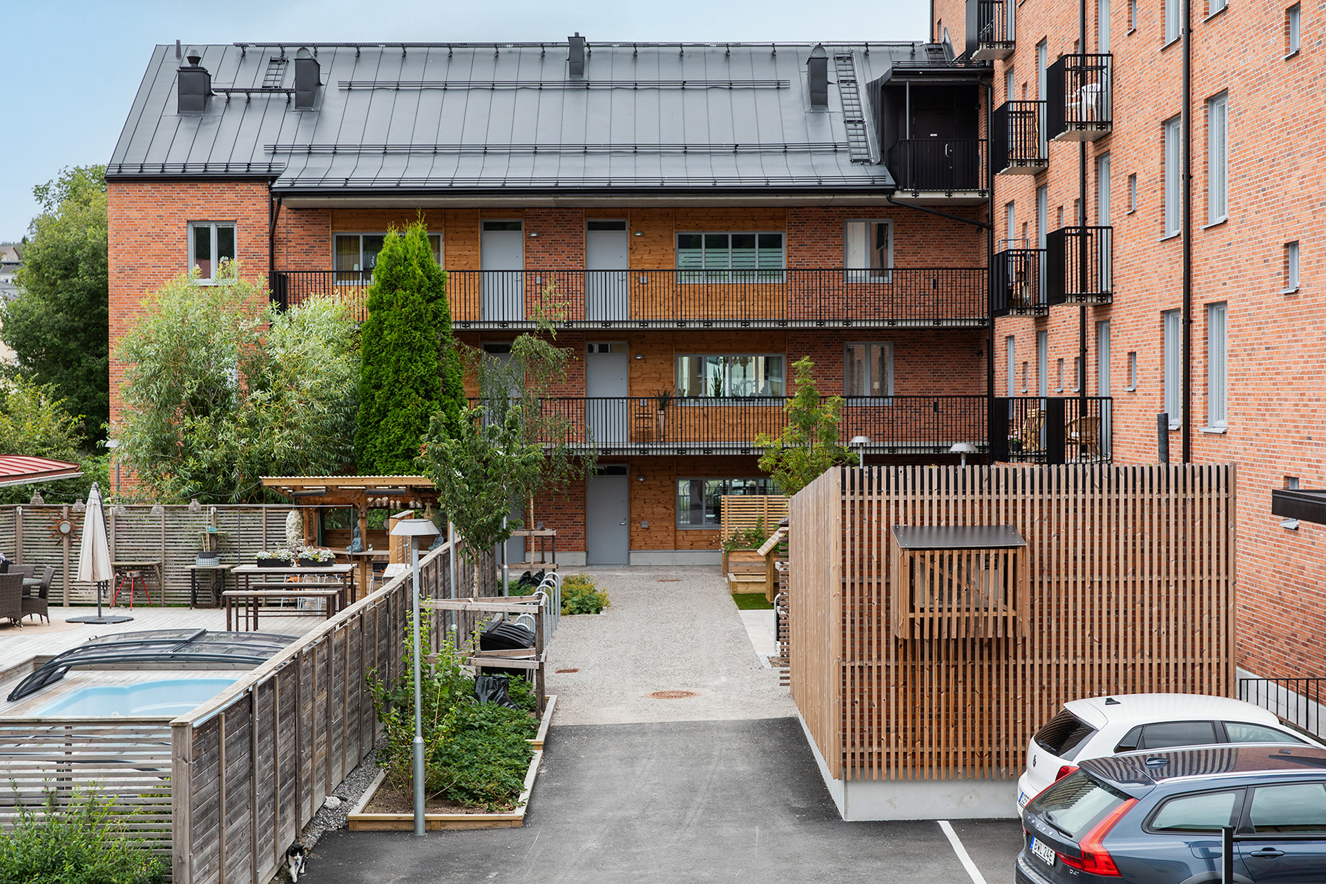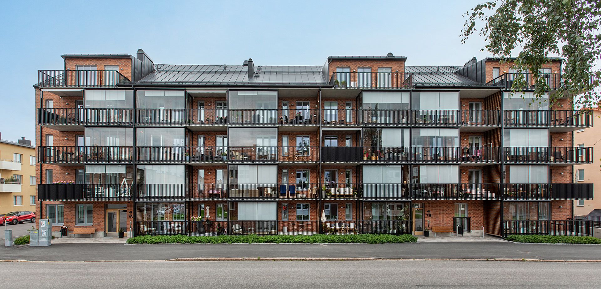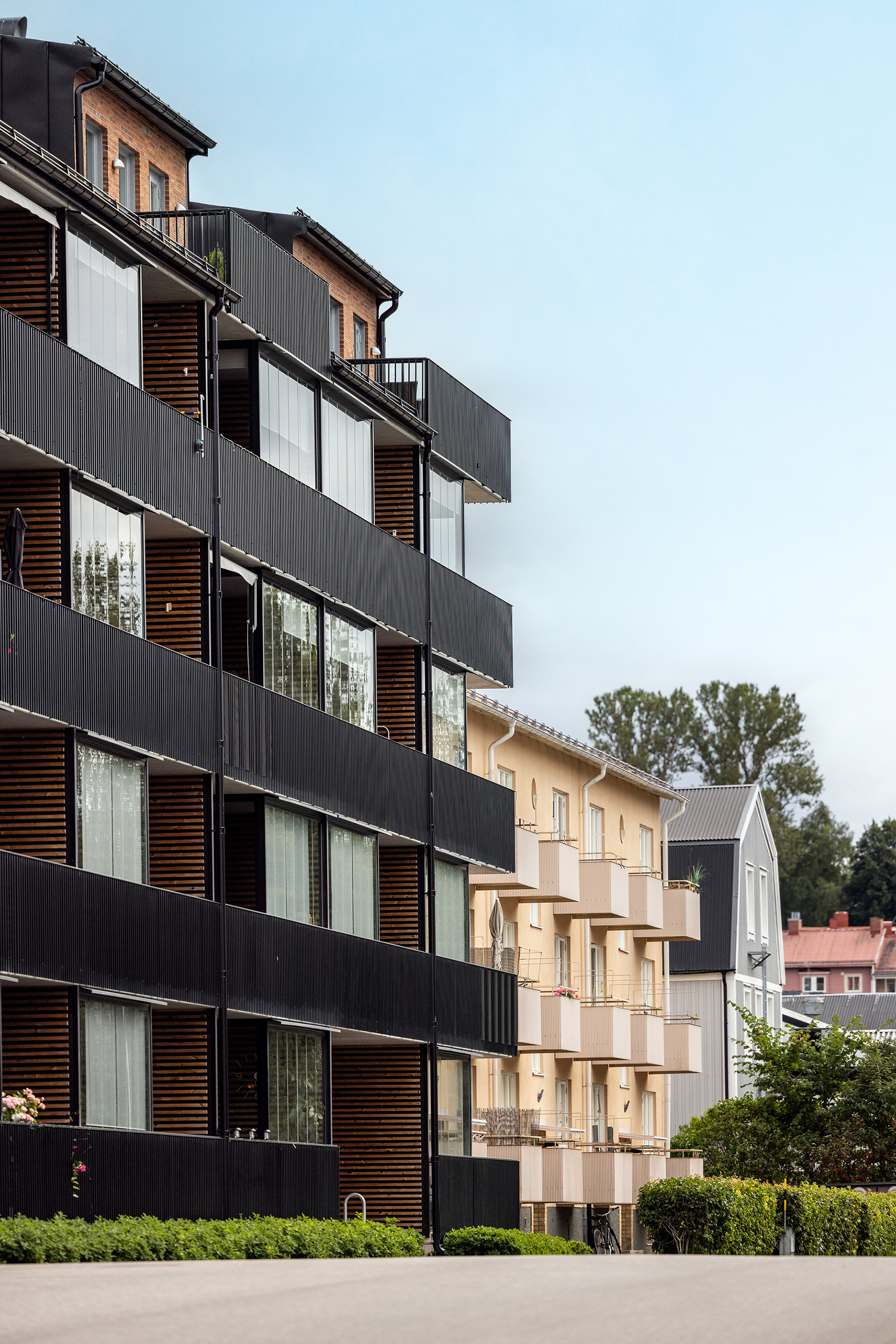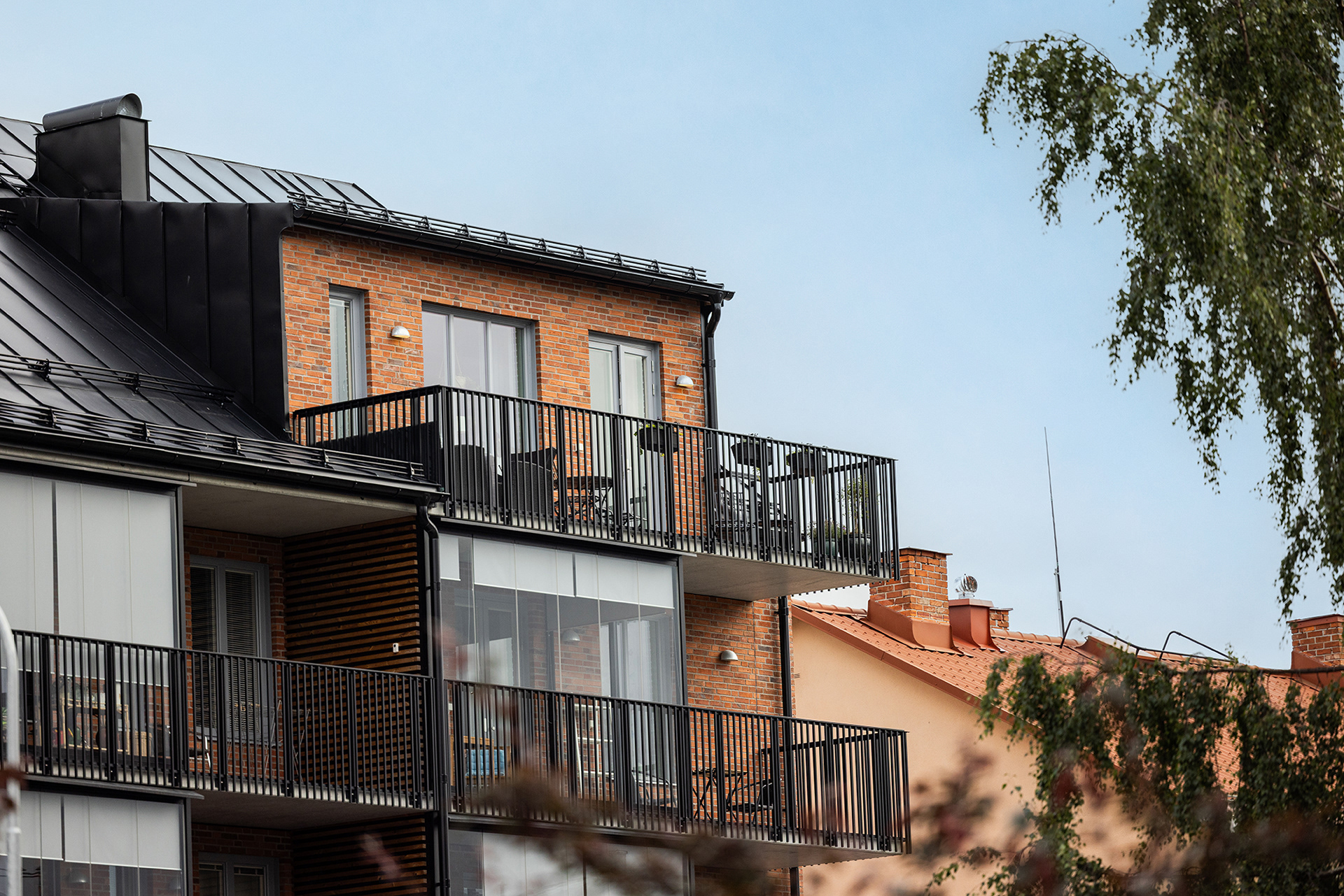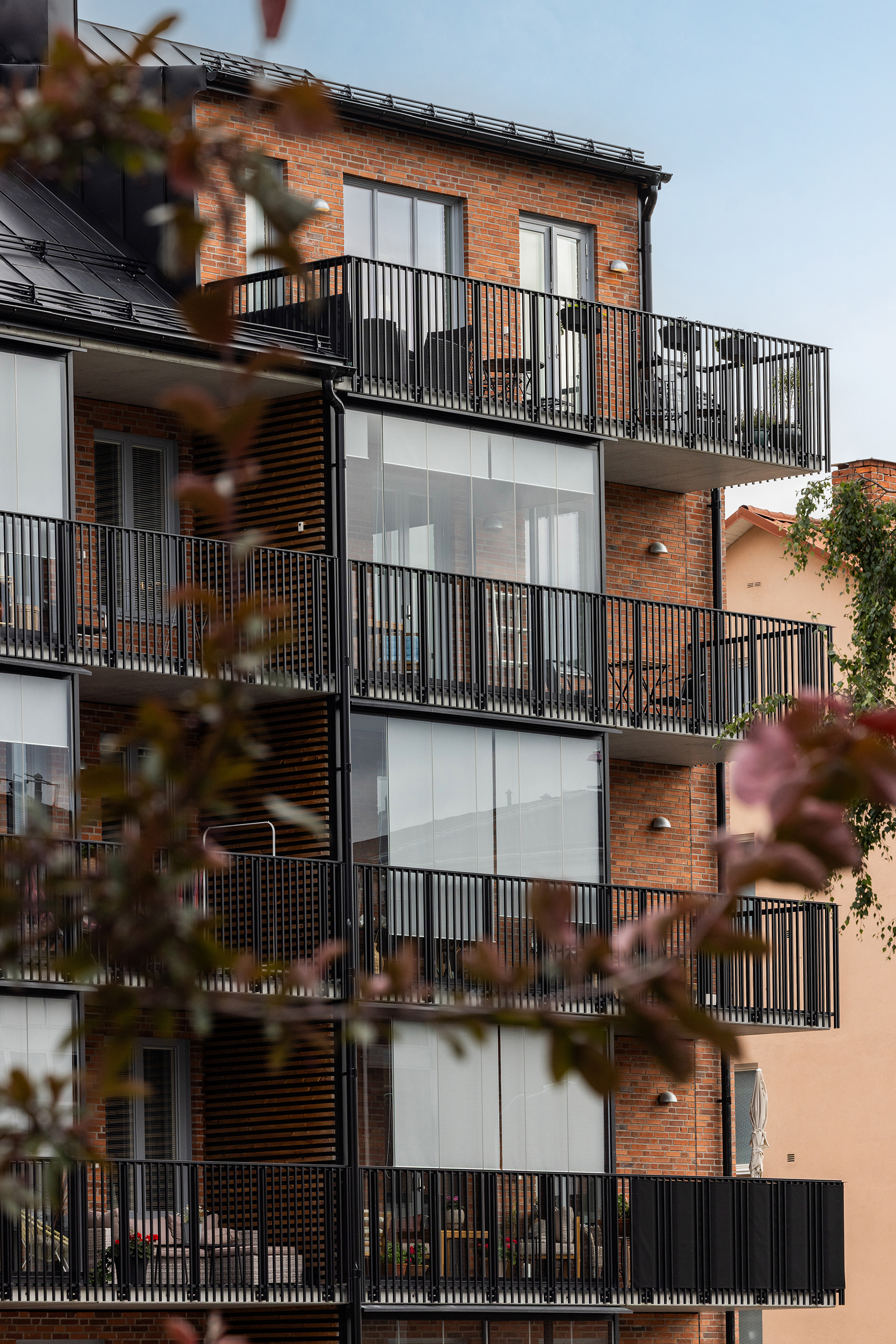 Generösa balkonger ger varje lägenhet en tydlig koppling till omgivningen och förlänger livet utomhus. Sovrum och mindre frukostbalkonger vetter mot den lugna gården, som erbjuder plats för odling och sociala möten. Vardagsrum och kök ansluter till en större västbalkong som fångar kvällssolen.