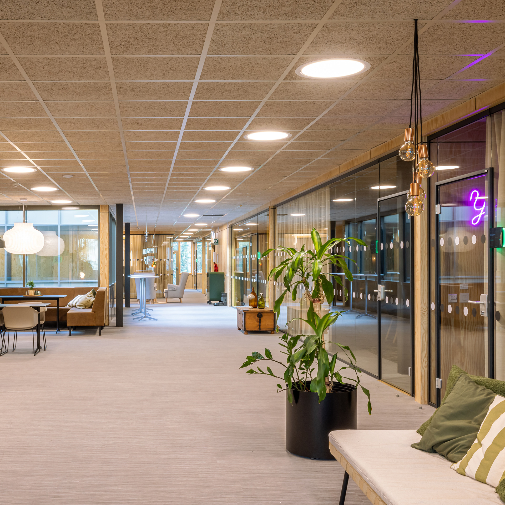Interiören av trä och de organiska formerna blir tillsammans med träd och grönska sammanhållande element i anläggningen.